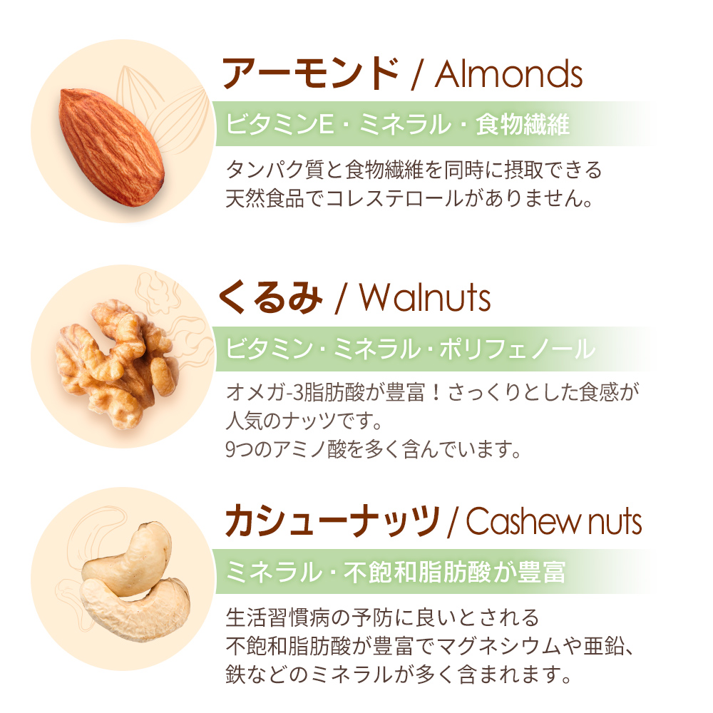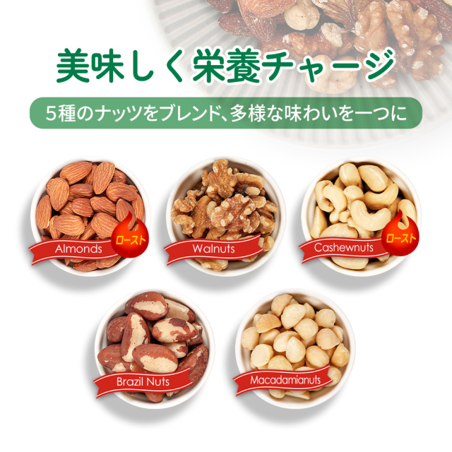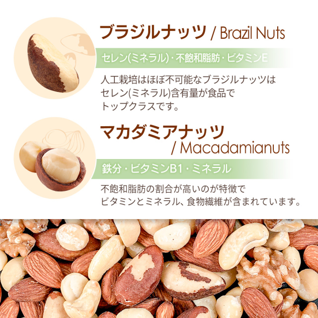 (アーモンド、カシューナッツは焙煎。くるみ、ブラジルナッツ、マカダミアナッツは生。)