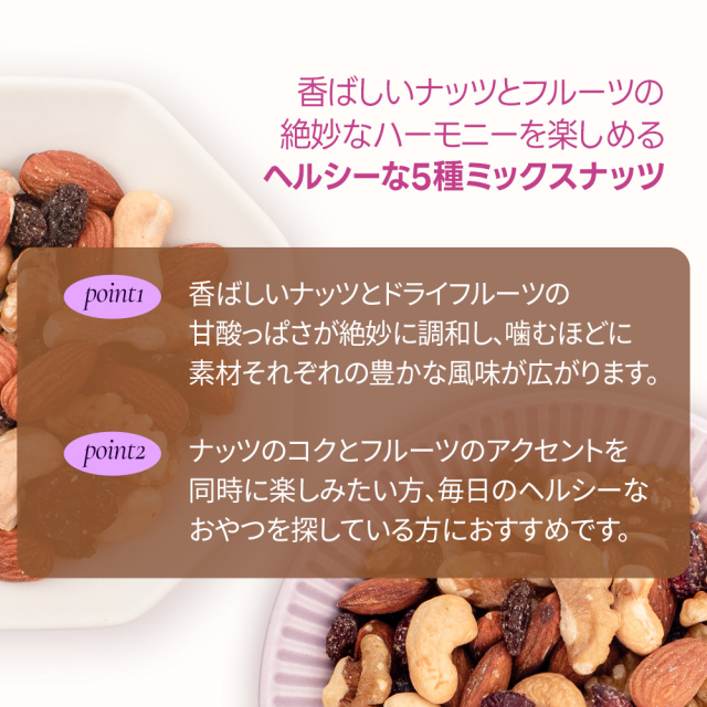 | 商品説明 | 香ばしいナッツと甘酸っぱいドライフルーツの絶妙なハーモニーを楽しめるヘルシーな5種ミックスナッツです。 厳選したアーモンド、くるみ、カシューナッツにレーズンとクランベリーを加え、素材それぞれの風味が絶妙に調和。食塩不使用で、素材本来の味わいをしっかり感じられます。 ポリフェノールや食物繊維も豊富に含まれ、健康的なおやつやリフレッシュタイムにぴったり。 保存に便利なチャック付き袋入りで、いつでも手軽に召し上がれます。 |