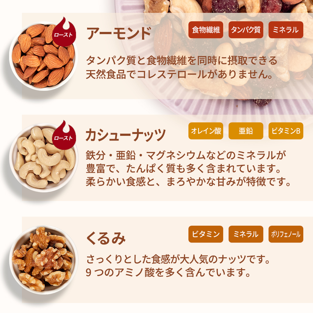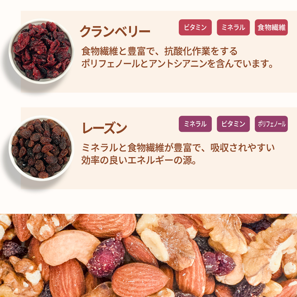アーモンド(アメリカ産)、くるみ、カシューナッツ、レーズン(レーズン、植物油脂)、乾燥クランベリー(クランベリー、砂糖、植物油脂)