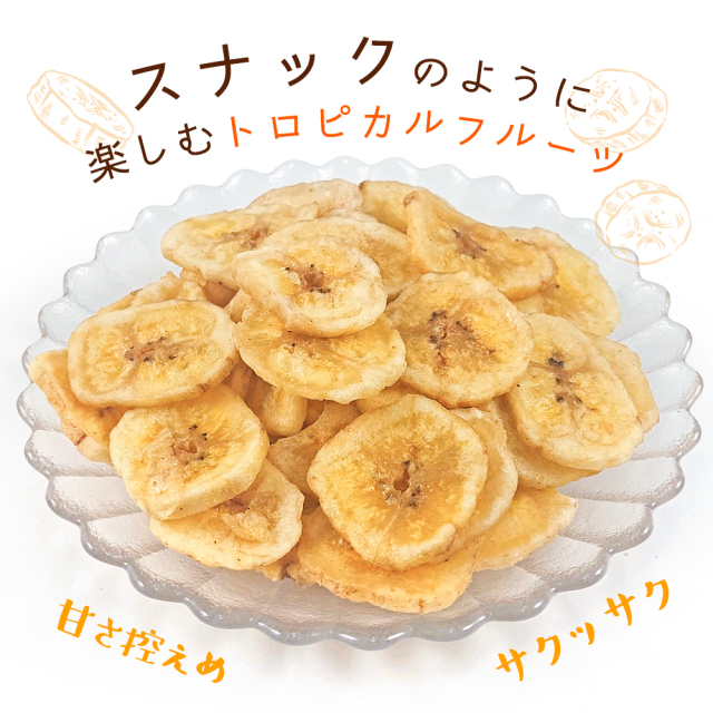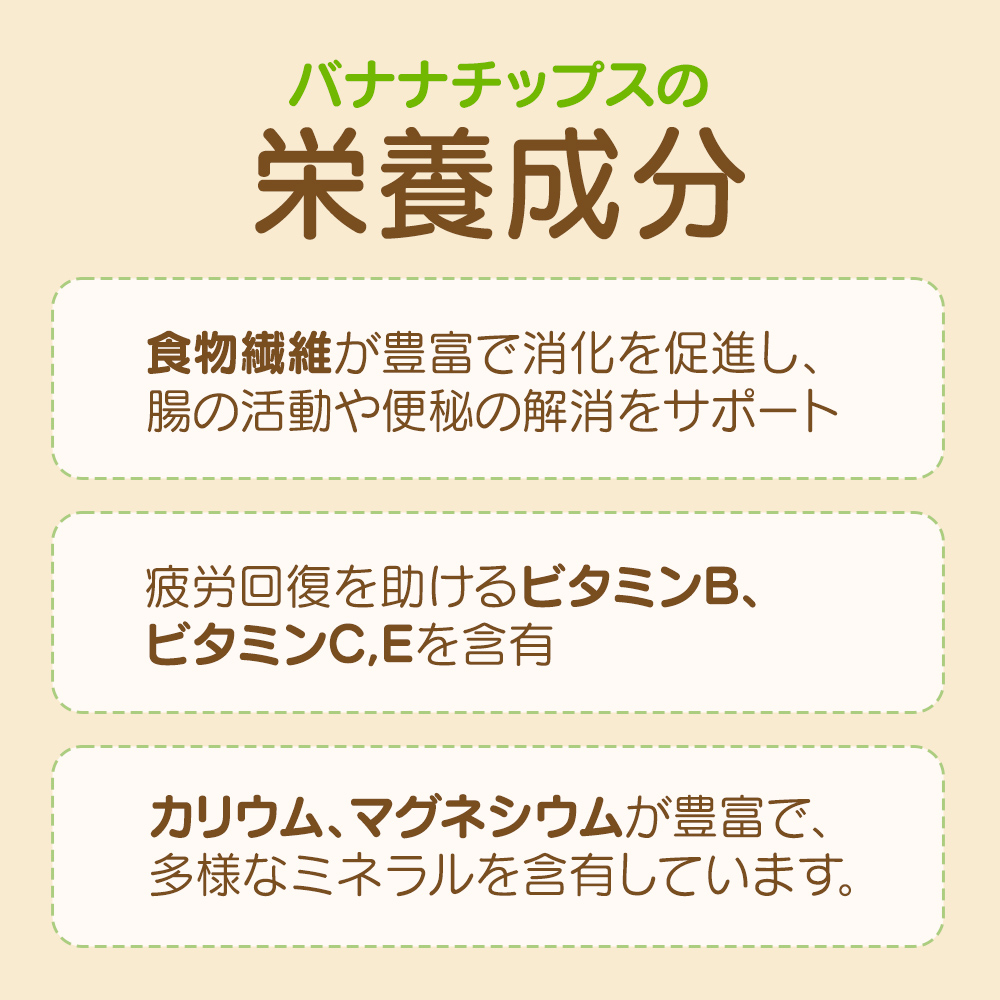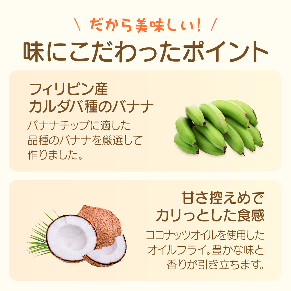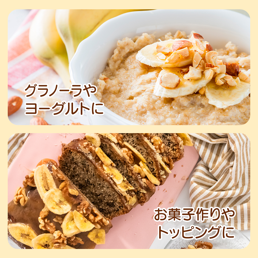 | 使用方法 | バナナチップスはそのまま食べるのはもちろん、朝食のシリアルやグラノーラに加えると風味と食感がさらに引き立ちます。バナナチップスを使った製パン、スイーツ作りにもご利用いただけます。 |