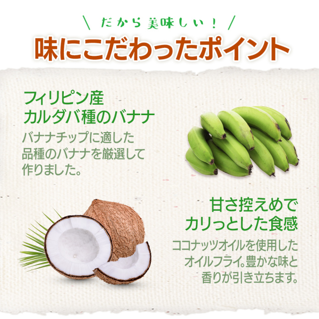 | 原材料名 | バナナ(フィリピン産)、ココナッツ油、砂糖、天然バナナ香料 |