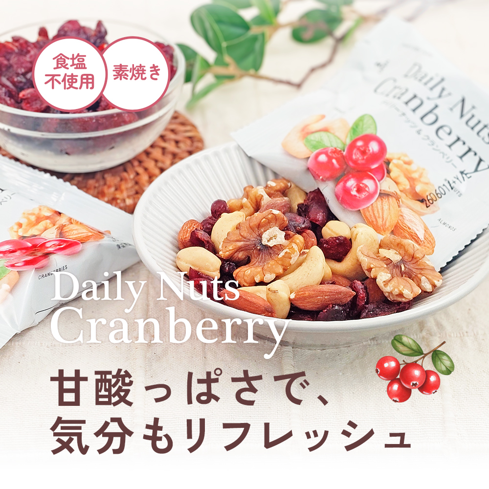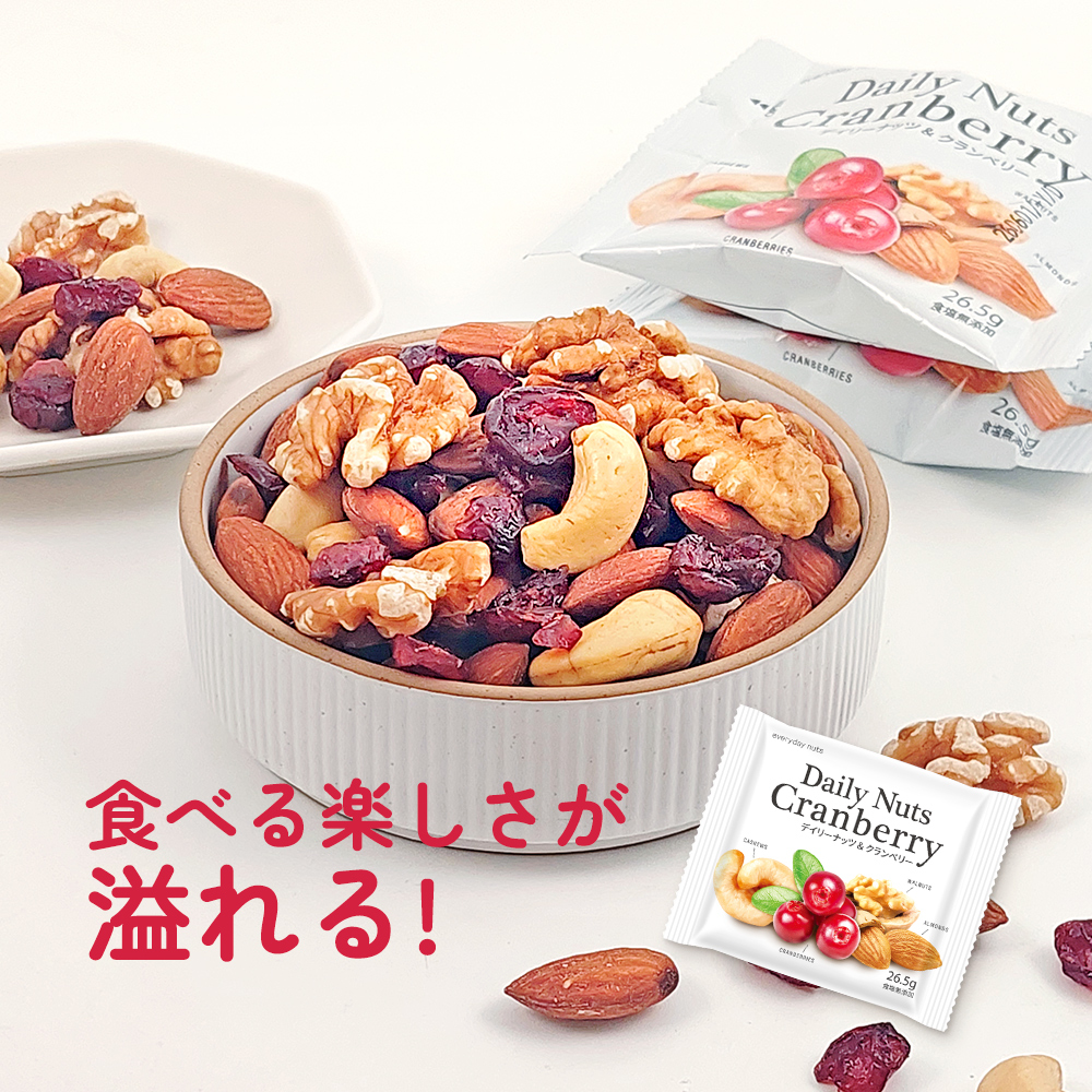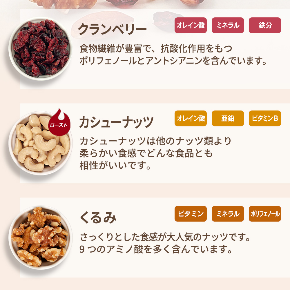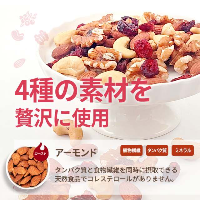 | 原材料名 | アーモンド(アメリカ産)、くるみ、カシューナッツ、乾燥クランベリー(クランベリー、砂糖、植物油脂) (アーモンド、カシューナッツは焙煎、くるみは生。) |