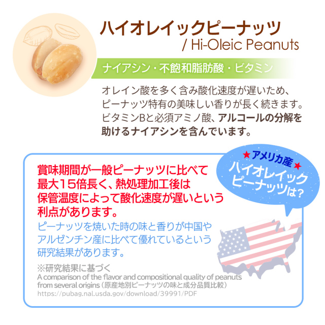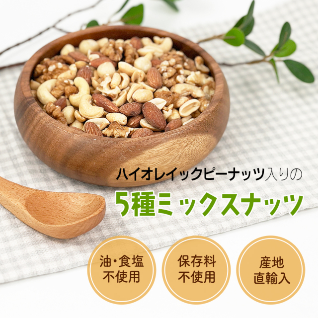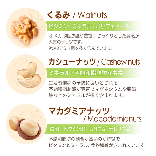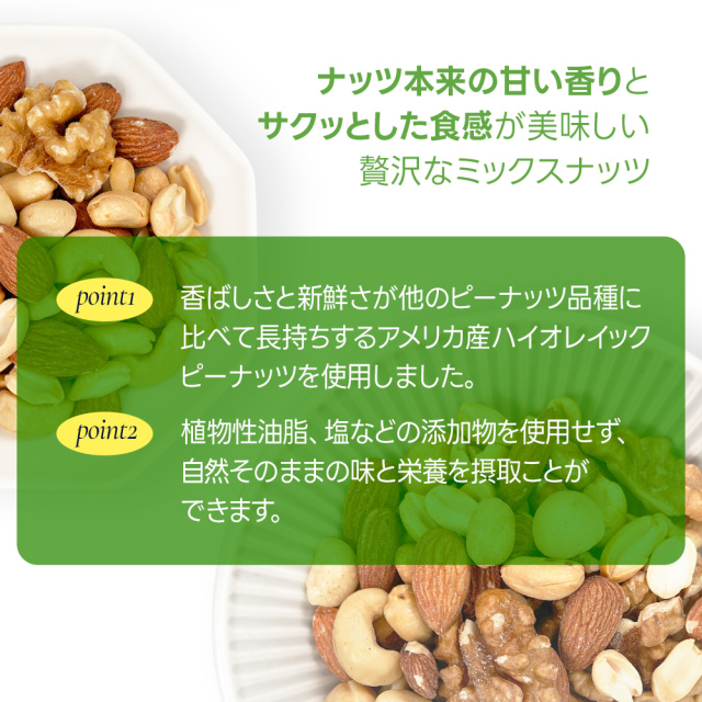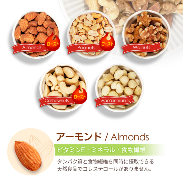 | 原材料名 | 落花生(アメリカ産)、アーモンド、くるみ、カシューナッツ、マカダミアナッツ (落花生とアーモンド、カシューナッツは焙煎。くるみとマカダミアナッツは生。) |